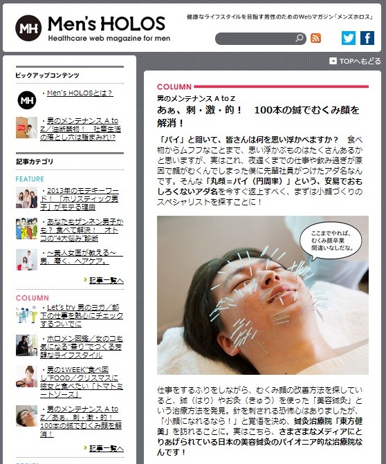 『Men’s HOLOS』むくみ解消 Men’s HOLOS 男のメンテナンスA to Z あぁ、刺・激・的! 100本の鍼でむくみ顔を解消! 男性の編集者さんが自ら当院(東京)の美容鍼灸の施術を体験。その模様を詳しくご紹介下さいました。