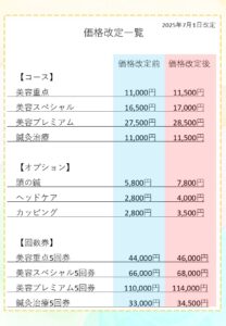 当院ではこれまで物価高騰の影響を受けながらも、できる限り価格の維持に努めてまいりましたが、昨今の原材料費や人件費、物流コストの上昇に伴い、誠に不本意ではございますが、【2025年7月1日】よりグラン治療院ブエノスカリン院につきまして施術メニューの価格改定を実施させていただく運びとなりました。